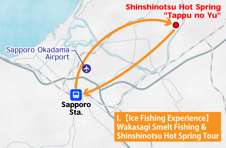 | 12:48~16:00 | Shinshinotsu Onsen “Tappunoyu” Lunch (12:50–13:30) *① Smelt fishing experience (13:30–16:00) *② Hot springs (after fishing–16:00) |